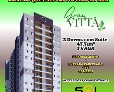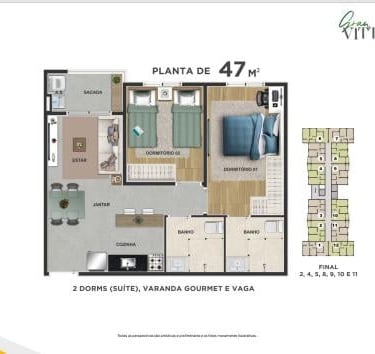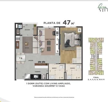 47,71 m² 2 dorms + suíte + terraço gourmet + vaga
