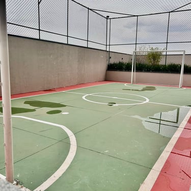 Quadra esportiva e fitness outdoor para prática de atividades físicas.